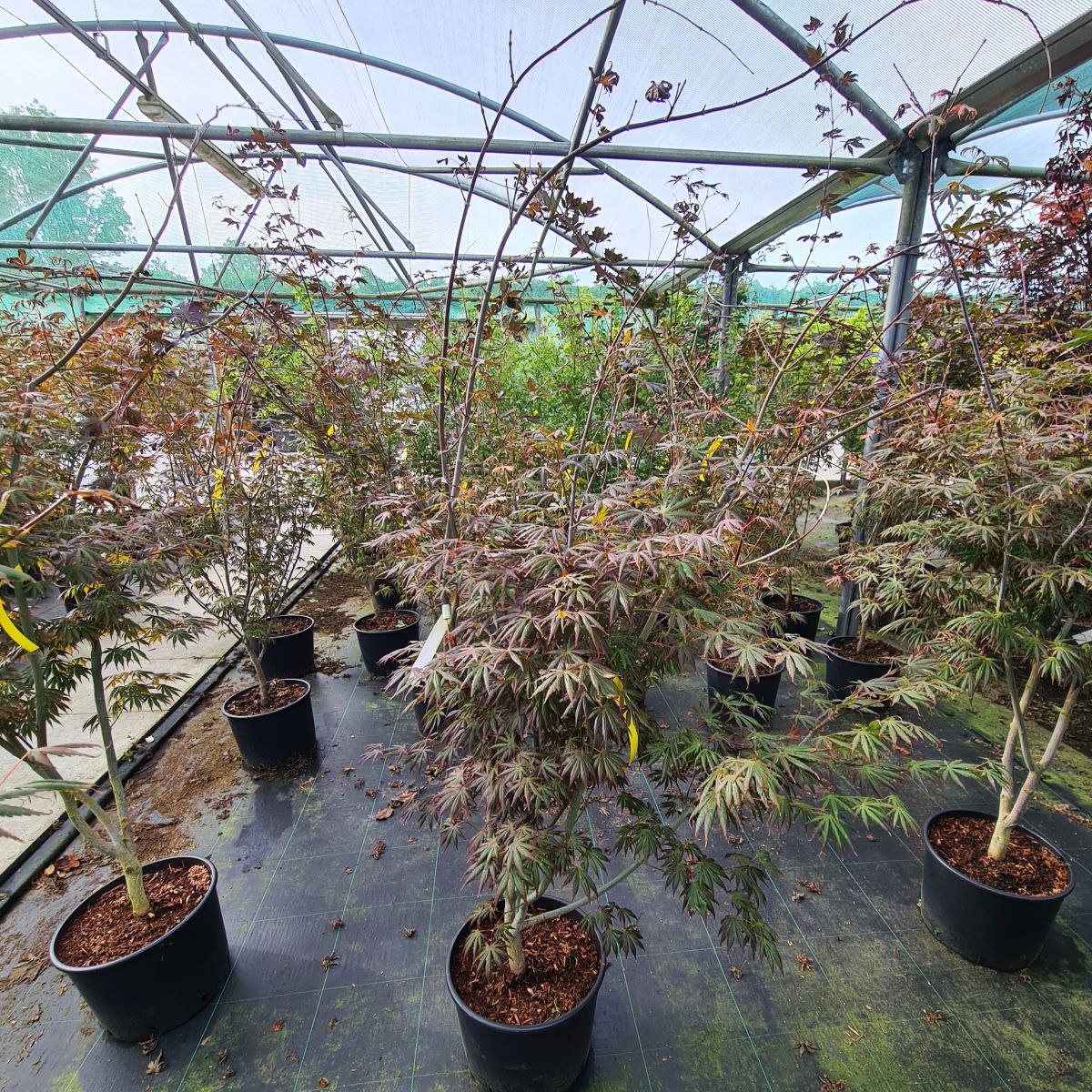 Japanese maple. A deep purple-red leafed tree turning bright red in autumn. Max Height 4m to 5m. Max Spread 3m. Full sun. Hardy. Back-fill with soil mixed with peat substitute and a suitable fertiliser.