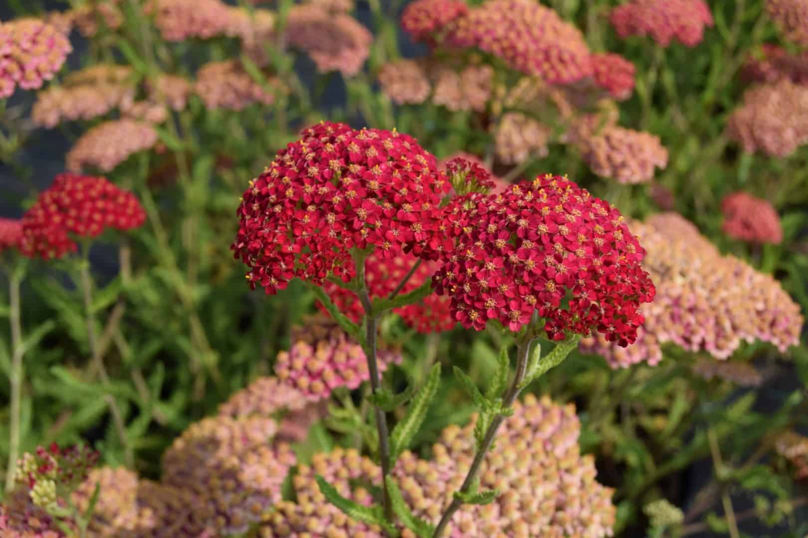 Yarrow. A perennial with dark green leaves. Orange-red flowerheads fade with age. Max Height 80cm. Max Spread 60cm. Flowers June to September. Full sun. Hardy. Water thoroughly before planting.
