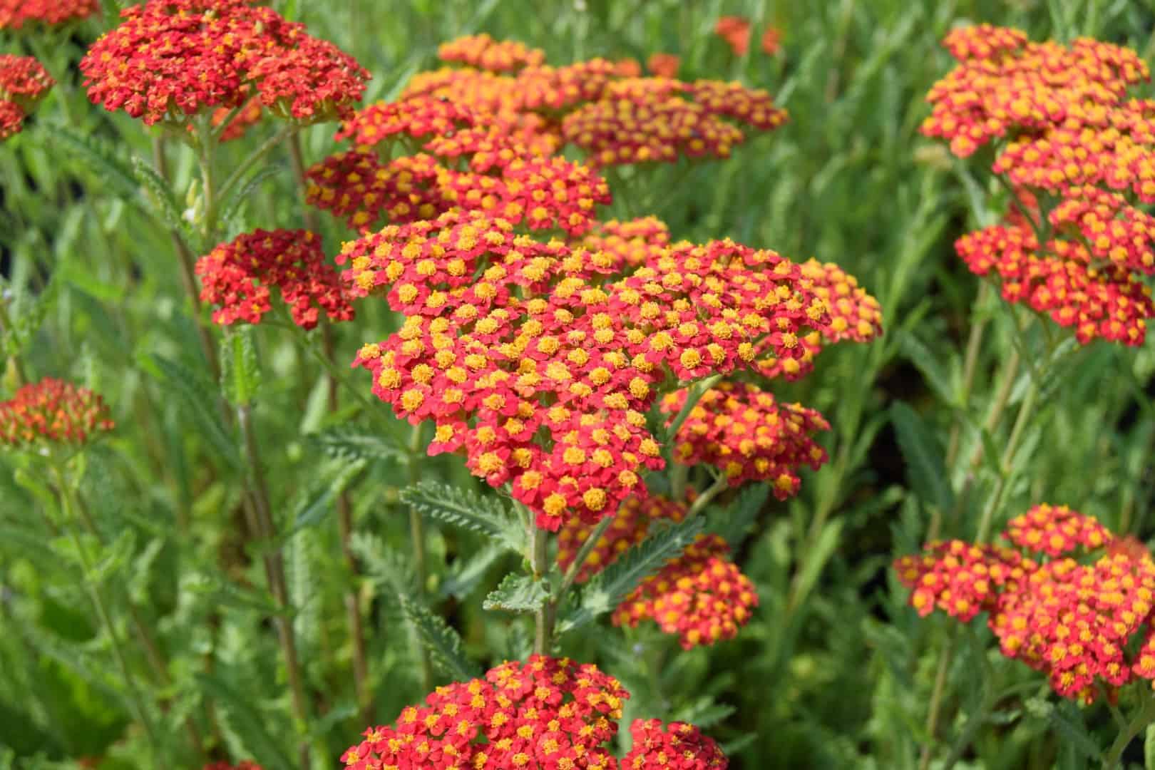Yarrow. Flat orange flowerheads. Max Height 60cm. Drought tolerant. Flowers June to September. Full sun. Hardy. Water thoroughly before planting.