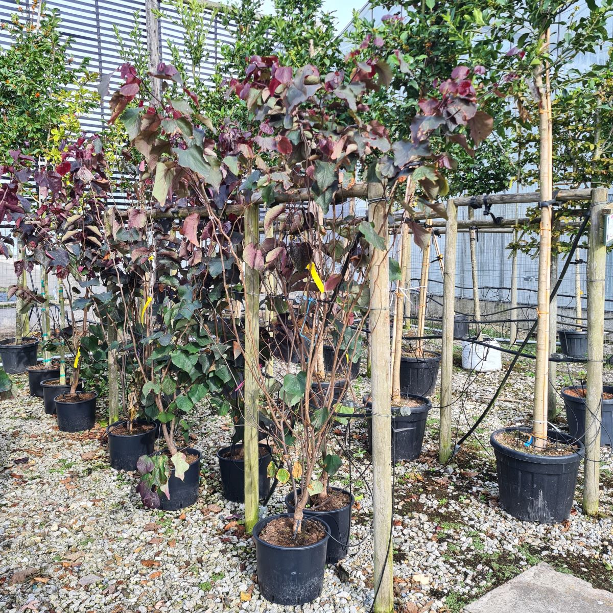 Eastern Redbud. A spreading shrub with beautiful; heart-shaped; dark purple-red leaves. Deep crimson; purple or pink flowers are borne before the leaves appear. Max Height 10m. Max Spread 10m. Full sun/partial shade. Hardy. Back-fill with soil mixed with peat substitute and a suitable fertiliser.