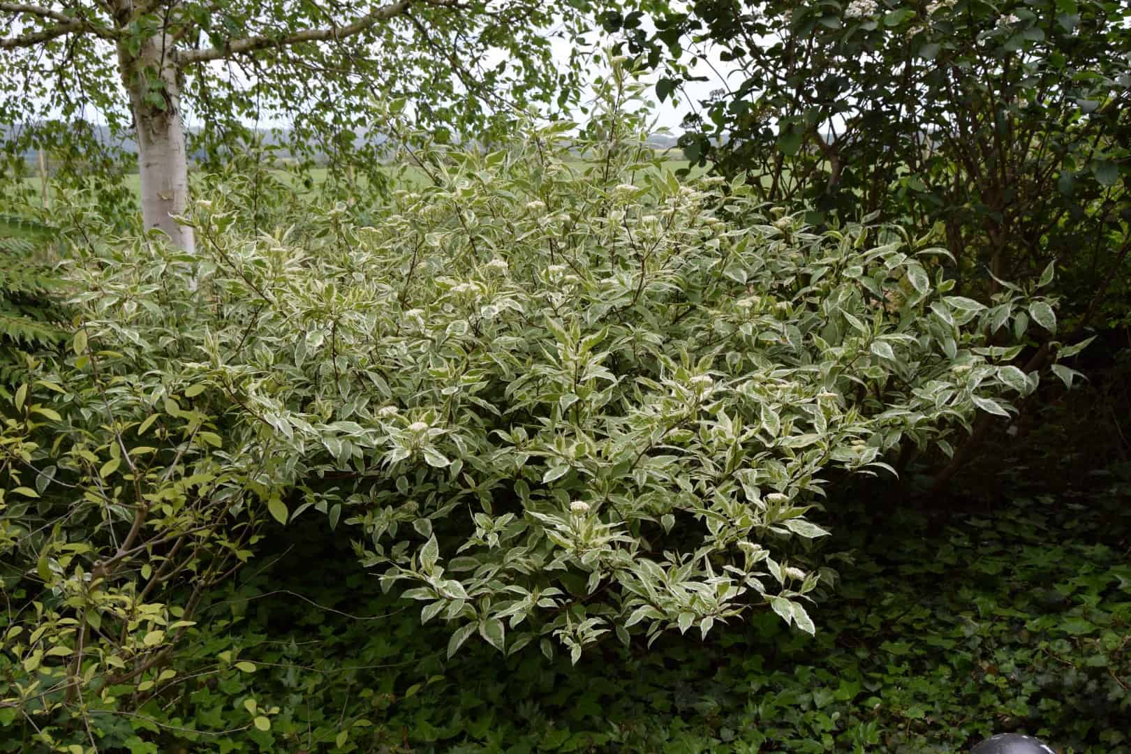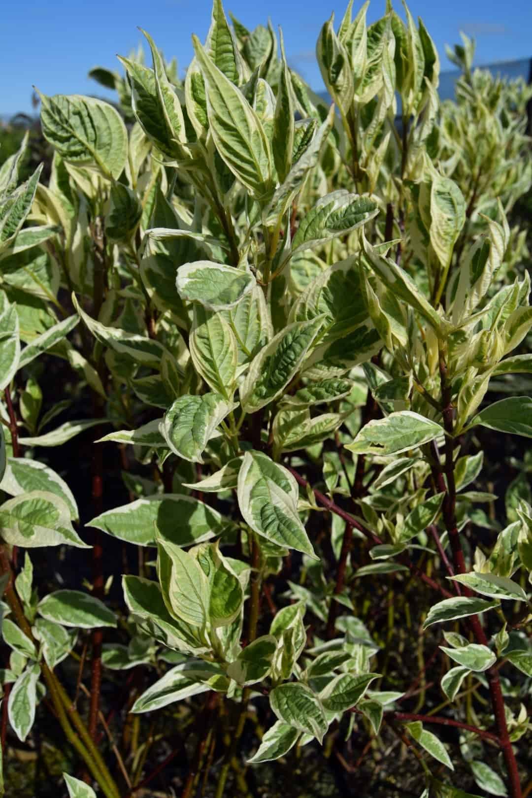 Red-barked Dogwood. A vigorous shrub with red winter shoots. Grey-green leaves; margined white; turn red in autumn; white flowers are followed by white berries; often tinged blue. Max Height 3m. Max Spread 3m. Flowers April to June. Fruits July. Full Sun. Hardy. Water thoroughly before planting.