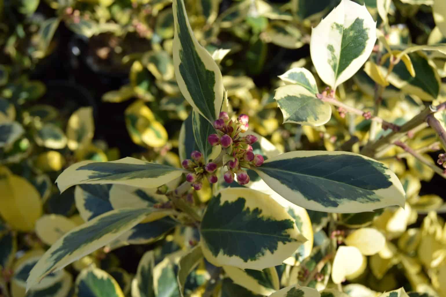 Holly. An erect evergreen shrub with grey-green mottled leaves with broad bright gold margins; produces bright red fruit. Max Height 6m. Max Spread 5m. Flowers May to June. Fruits September. Full Sun. Hardy. Back-fill with soil mixed with peat substitute and a suitable fertiliser.